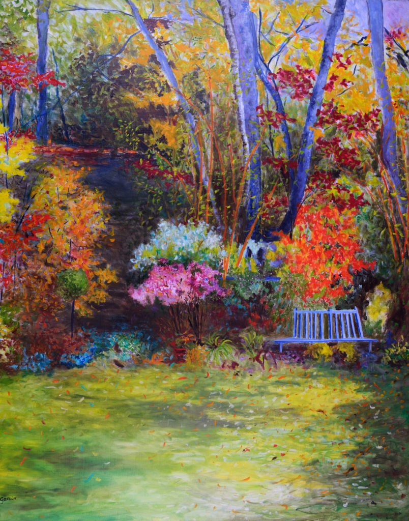 grand paysage au banc bleu, huile sur toile. 160 X 130 cm